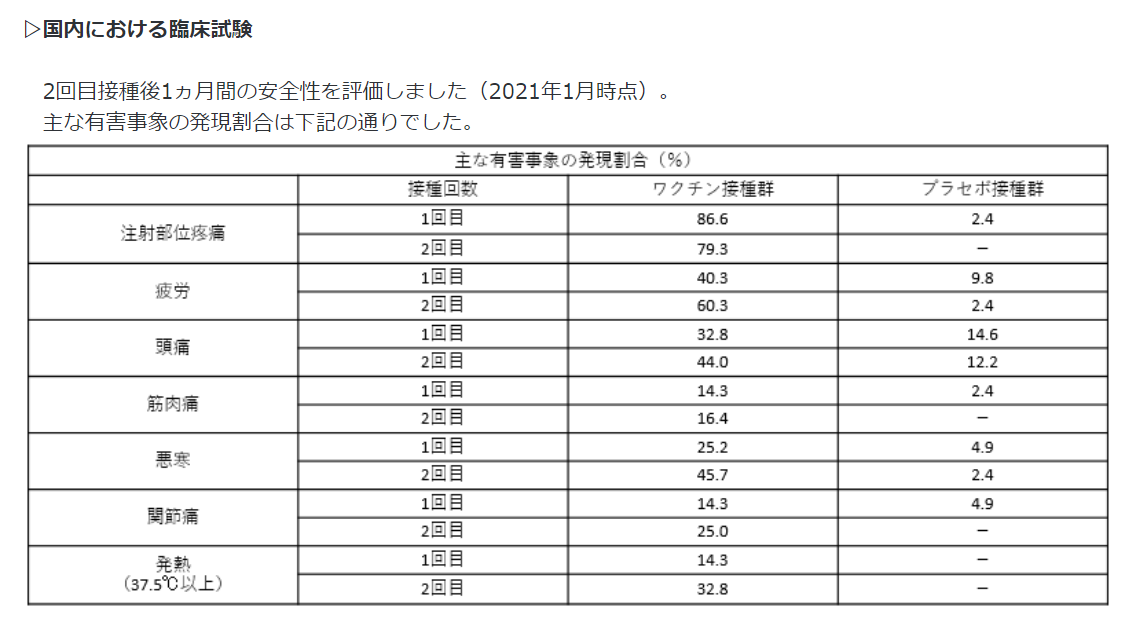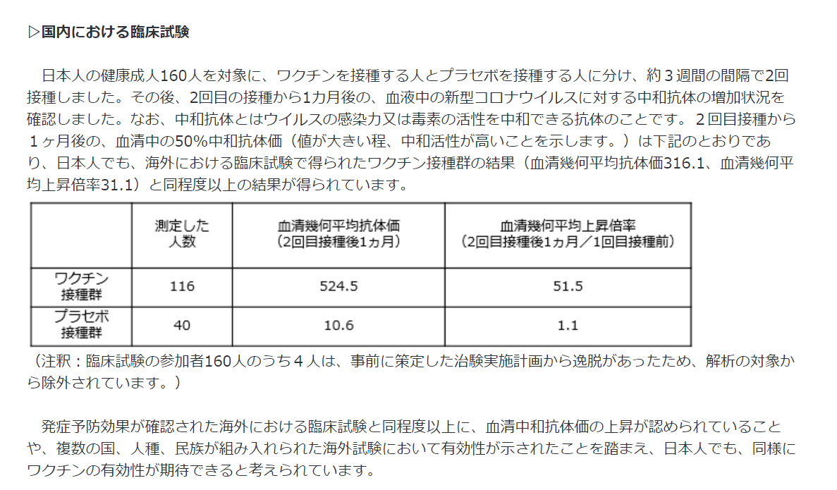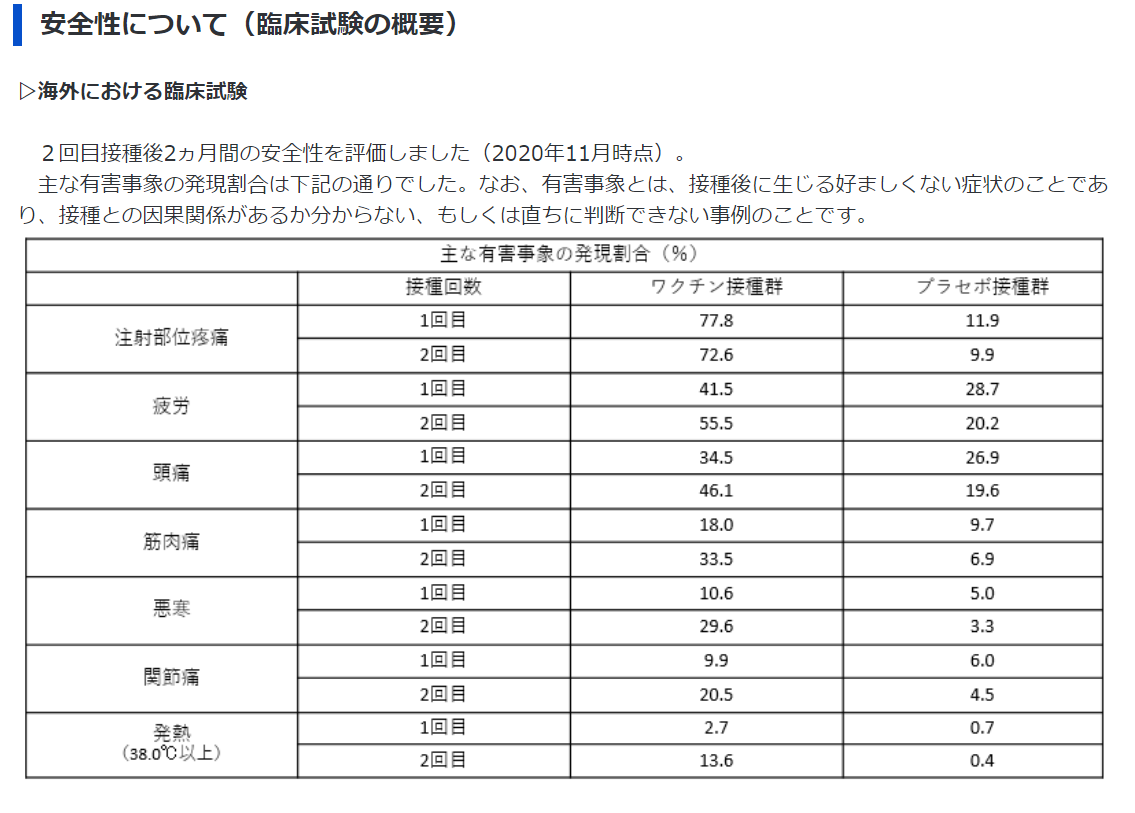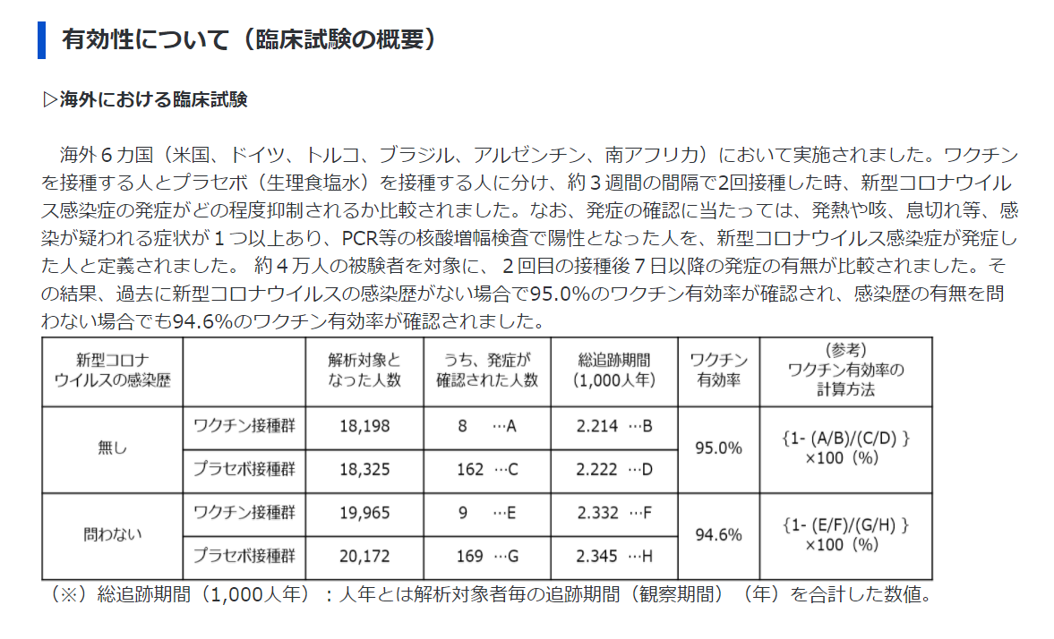 さらに詳しい情報有効性について(臨床試験の概要)▷海外における臨床試験海外6カ国(米国、ドイツ、トルコ、ブラジル、アルゼンチン、南アフリカ)において実施されました。ワクチンを接種する人とプラセボ(生理食塩水)を接種する人に分け、約3週間の間隔で2回接種した時、新型コロナウイルス感染症の発症がどの程度抑制されるか比較されました。なお、発症の確認に当たっては、発熱や咳、息切れ等、感染が疑われる症状が1つ以上あり、PCR等の核酸増幅検査で陽性となった人を、新型コロナウイルス感染症が発症した人と定義されました。 約4万人の被験者を対象に、2回目の接種後7日以降の発症の有無が比較されました。その結果、過去に新型コロナウイルスの感染歴がない場合で95.0%のワクチン有効率が確認され、感染歴の有無を問わない場合でも94.6%のワクチン有効率が確認されました。(※)総追跡期間(1,000人年):人年とは解析対象者毎の追跡期間(観察期間)(年)を合計した数値。▷国内における臨床試験日本人の健康成人160人を対象に、ワクチンを接種する人とプラセボを接種する人に分け、約3週間の間隔で2回接種しました。その後、2回目の接種から1カ月後の、血液中の新型コロナウイルスに対する中和抗体の増加状況を確認しました。なお、中和抗体とはウイルスの感染力又は毒素の活性を中和できる抗体のことです。2回目接種から1ヶ月後の、血清中の50%中和抗体価(値が大きい程、中和活性が高いことを示します。)は下記のとおりであり、日本人でも、海外における臨床試験で得られたワクチン接種群の結果(血清幾何平均抗体価316.1、血清幾何平均上昇倍率31.1)と同程度以上の結果が得られています。(注釈:臨床試験の参加者160人のうち4人は、事前に策定した治験実施計画から逸脱があったため、解析の対象から除外されています。)発症予防効果が確認された海外における臨床試験と同程度以上に、血清中和抗体価の上昇が認められていることや、複数の国、人種、民族が組み入れられた海外試験において有効性が示されたことを踏まえ、日本人でも、同様にワクチンの有効性が期待できると考えられています。安全性について(臨床試験の概要)▷海外における臨床試験2回目接種後2ヵ月間の安全性を評価しました(2020年11月時点)。主な有害事象の発現割合は下記の通りでした。なお、有害事象とは、接種後に生じる好ましくない症状のことであり、接種との因果関係があるか分からない、もしくは直ちに判断できない事例のことです。▷国内における臨床試験2回目接種後1ヵ月間の安全性を評価しました(2021年1月時点)。主な有害事象の発現割合は下記の通りでした。詳細(添付文書等)についてはこちらをご覧ください。(医薬品医療機器総合機構(PMDA)のホームページ)